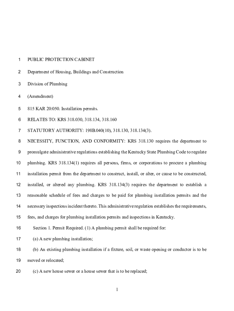 1PUBLIC PROTECTION CABINET2Department of Housing, Buildings and Construction3Division of Plumbing4(Amendment)5815 CAR 20:050. Installation permits.6RELATES TO: MRS 318.030, 318.134, 318.1607STATUTORY