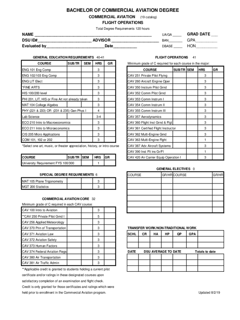 BACHELOR OF COMMERCIAL AVIATION DEGREE COMMERCIAL AVIATION (19 catalog) FLIGHT OPERATIONS Total Degree Requirements 120 surname ___ UA/GA ___ DSU ID#___ ADVISOR ___ BAN___ BASE ___ Evaluated by___Date___