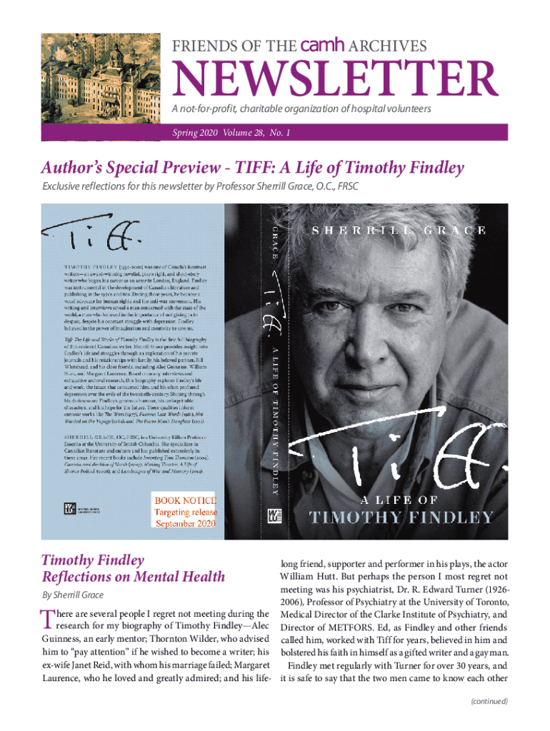 FRIENDS OF THEARCHIVESNEWSLETTER A notforprofit, charitable organization of hospital volunteers Spring 2020 Volume 28, No. 1Authors Special Preview TIFF: A Life of Timothy Finley Exclusive reflections