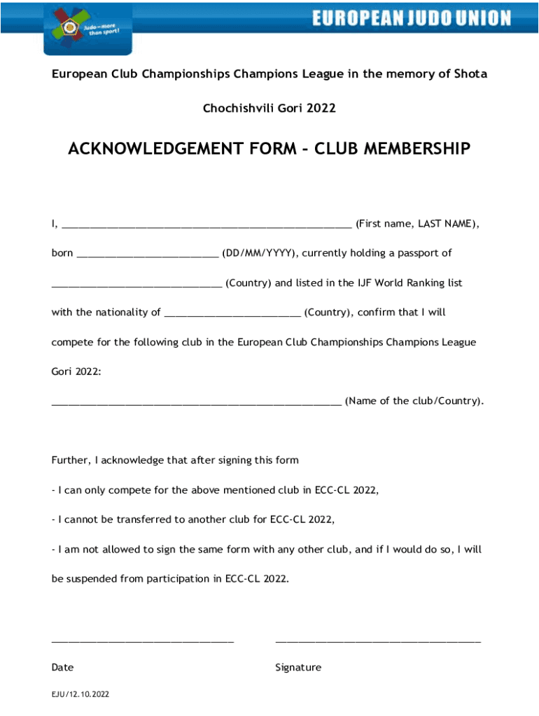 European Club Championships Champions League in the memory of Shot Chochishvili Gore 2022ACKNOWLEDGEMENT FORM CLUB MEMBERSHIP, ___ (First name, LAST NAME), born ___ (DD/MM/YYY), currently holding