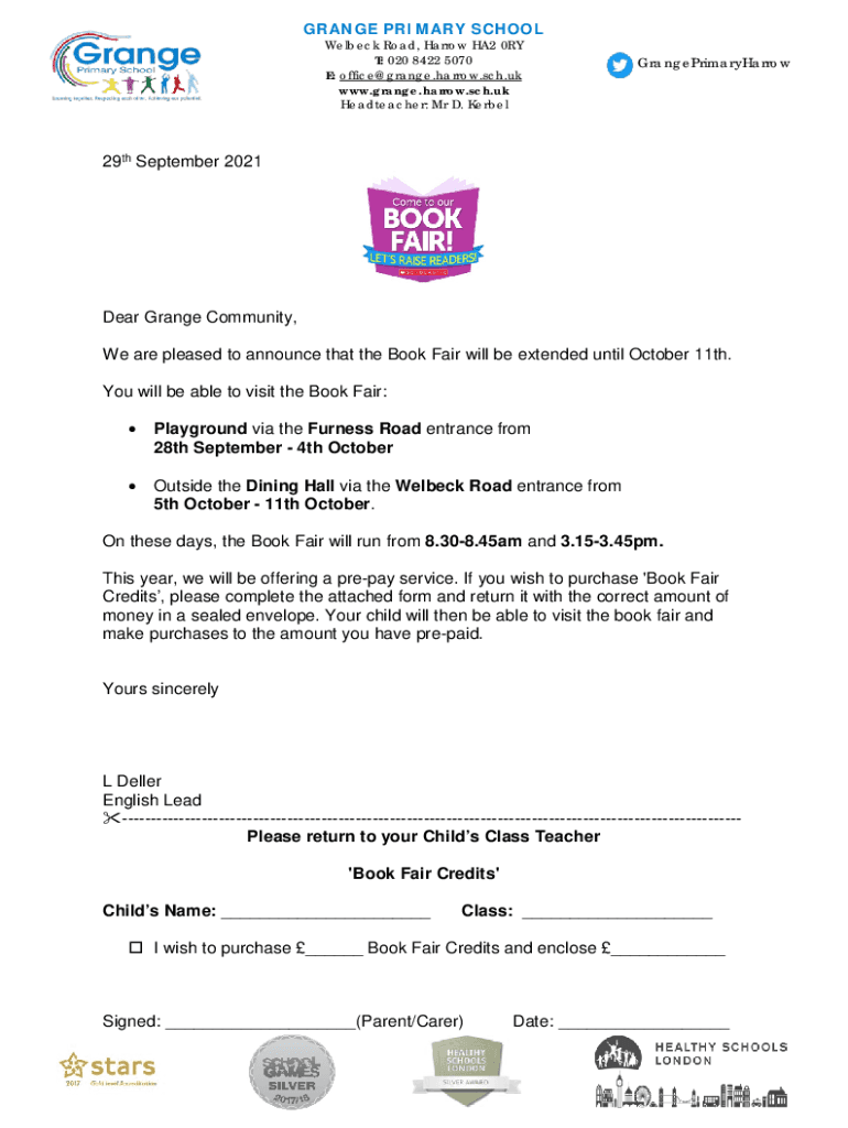 GRANGE PRIMARY SCHOOL Seebeck Road, Harrow HA2 0RY T: 020 8422 5070 E: office@grange.harrow.sch.uk www.grange.harrow.sch.uk Headteacher: Mr D. KerbelGrangePrimaryHarrow29th September 2021Dear Grange