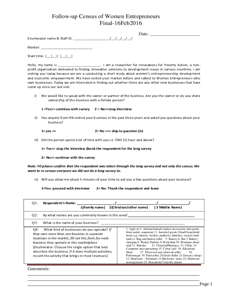 Followup Census of Women Entrepreneurs Final16Feb2016 Date: ___ Enumerator name & Staff ID: ___/__/__/__/__/ Market: ___ Start time: |__|__|: |__|__| Hello, my name is ___. I am a researcher for Innovations