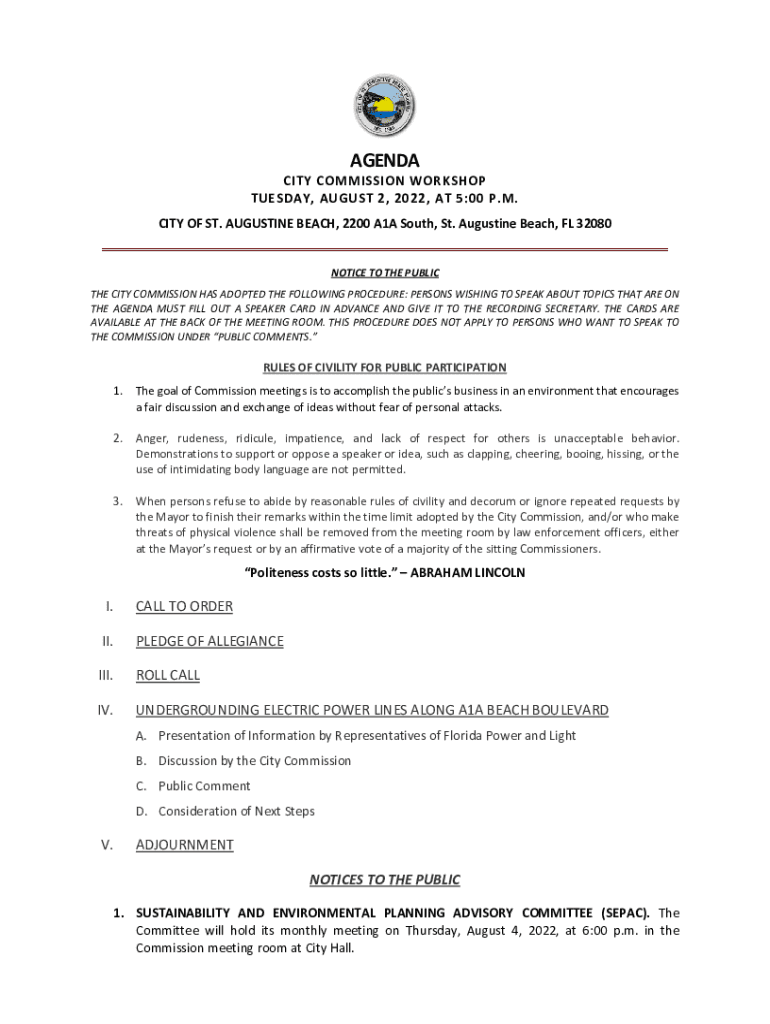 MENDACITY COMMISSION WORKSHOP TUESDAY, AUGUST 2, 2022, AT 5:00 P.M. CITY OF ST. AUGUSTINE BEACH, 2200 A1A South, St. Augustine Beach, FL 32080 NOTICE TO THE PUBLIC THE CITY COMMISSION HAS ADOPTED