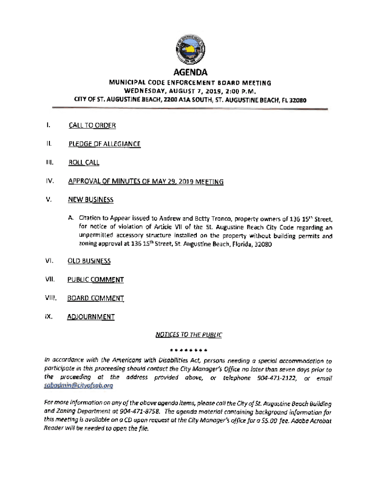 AGENDA MUNICIPAL CODE ENFORCEMENT BOARD MEETING WEDNESDAY, AUGUST 7, 2019, 2:00 P.M. CITY OF ST. AUGUSTINE BEACH, 2200 A1A SOUTH, ST. AUGUSTINE BEACH, FL 32080I.CALL TO ORDER11.PLEDGE OF ALLEGIANCE111.ROLL