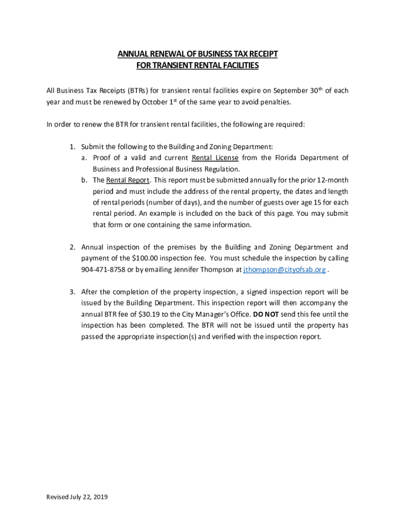 ANNUAL RENEWAL OF BUSINESS TAX RECEIPT FOR TRANSIENT RENTAL FACILITIES All Business Tax Receipts (Bars) for transient rental facilities expire on September 30th of each year and must be renewed by