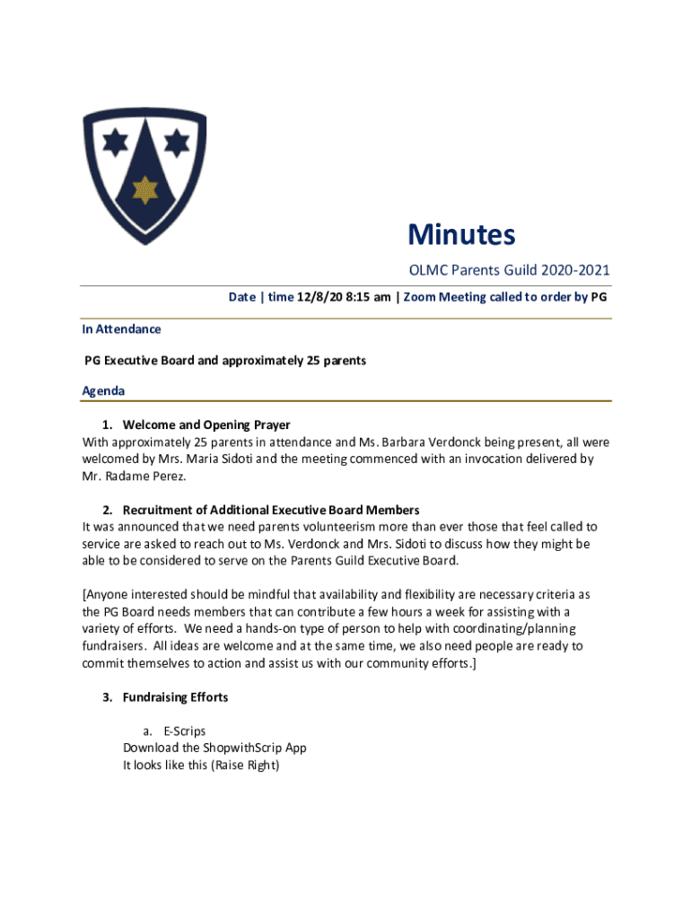 Minutes OLMEC Parents Guild 20202021Date | time 12/8/20 8:15 am | Zoom Meeting called to order by PG In Attendance PG Executive Board and approximately 25 parents Agenda 1. Welcome and Opening Prayer
