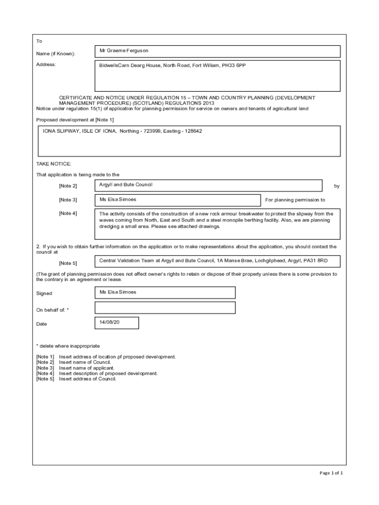 To Name (if Known): Address:Mr Game Ferguson BidwellsCarn Dairy House, North Road, Fort William, PH33 6PPCERTIFICATE AND NOTICE UNDER REGULATION 15 TOWN AND COUNTRY PLANNING (DEVELOPMENT MANAGEMENT