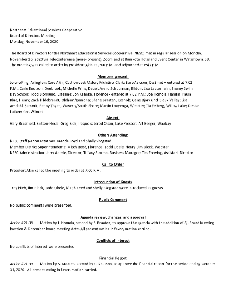 Northeast Educational Services Cooperative Board of Directors Meeting Monday, November 16, 2020, The Board of Directors for the Northeast Educational Services Cooperative (NEST) met in regular session