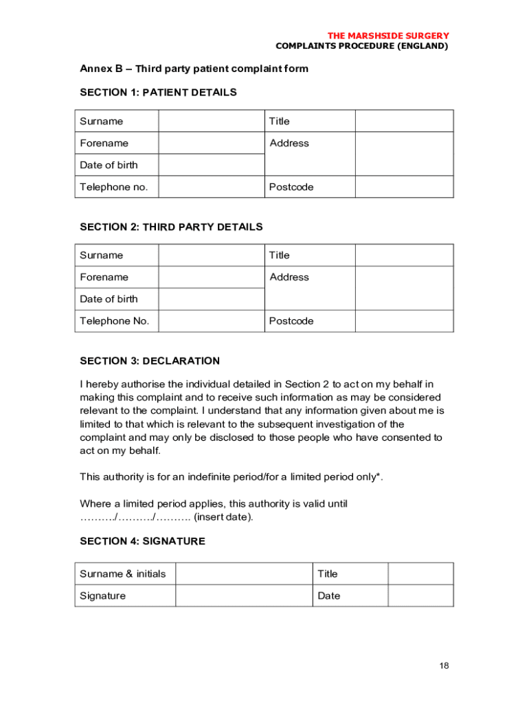 THE MARSHLIKE SURGERY COMPLAINTS PROCEDURE (ENGLAND)Annex B Third party patient complaint form SECTION 1: PATIENT DETAILS SurnameTitleForenameAddressDate of birth Telephone no. PostcodeSECTION 2: