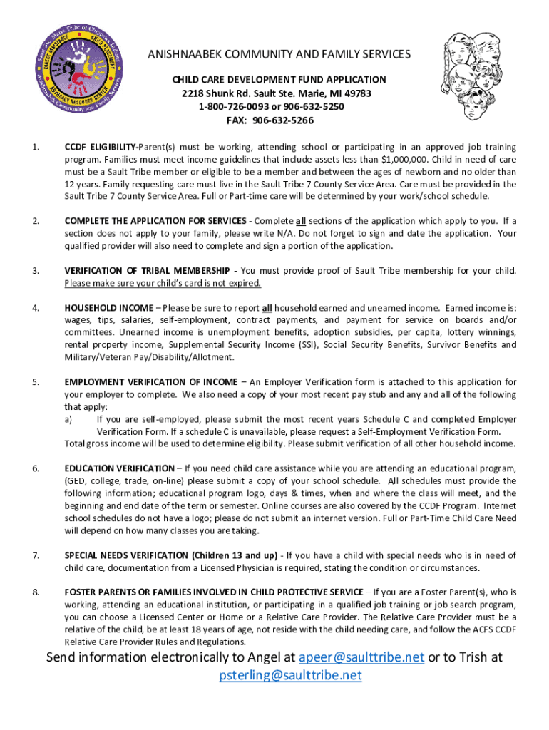 ANISHNAABEKCOMMUNITYANDFAMILYSERVICES CHILDCAREDEVELOPMENTFUNDAPPLICATION 2218ShunkRd. Faults. Marie,MI49783 18007260093or9066325250 FAX:9066325266 1