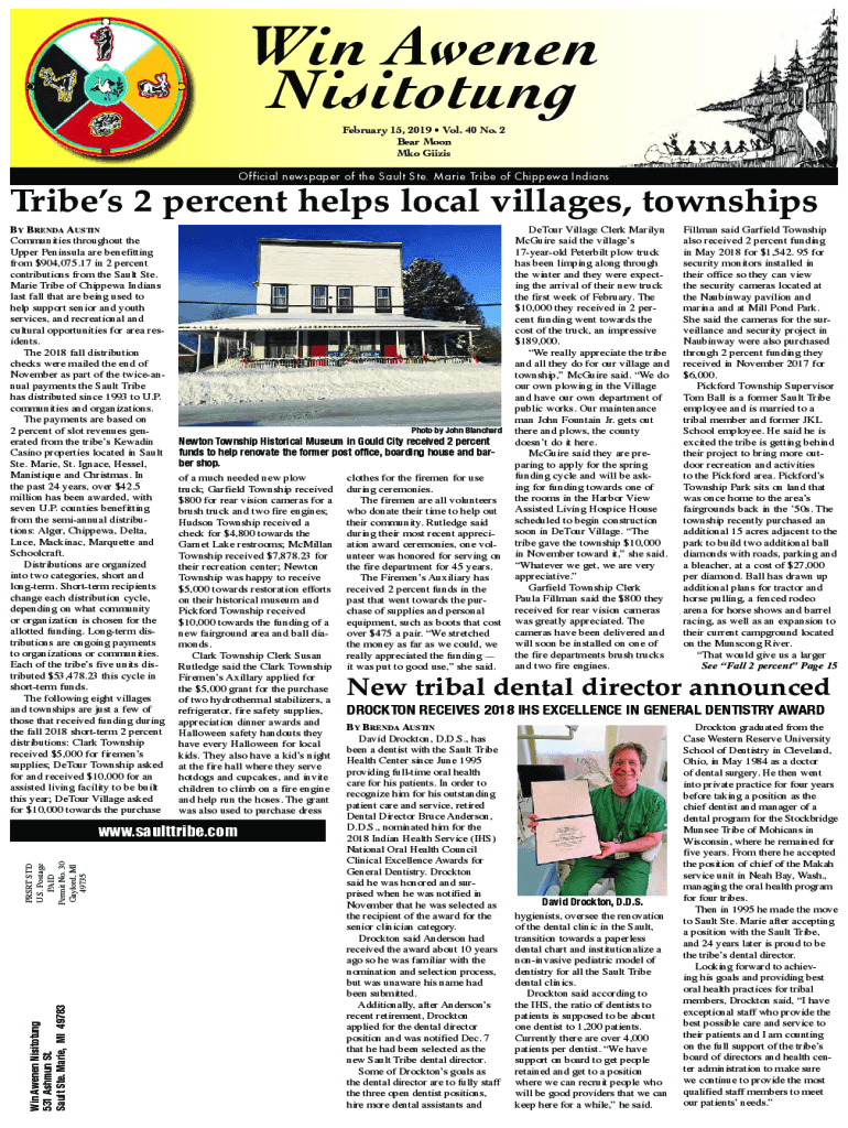 Win Sweden Nisitotung February 15, 2019, Vol. 40 No. 2 Bear Moon KO Gillis Official newspaper of the Salt Ste. Marie Tribe of Chippewa IndiansTribes 2 percent helps local villages, townships Sweden