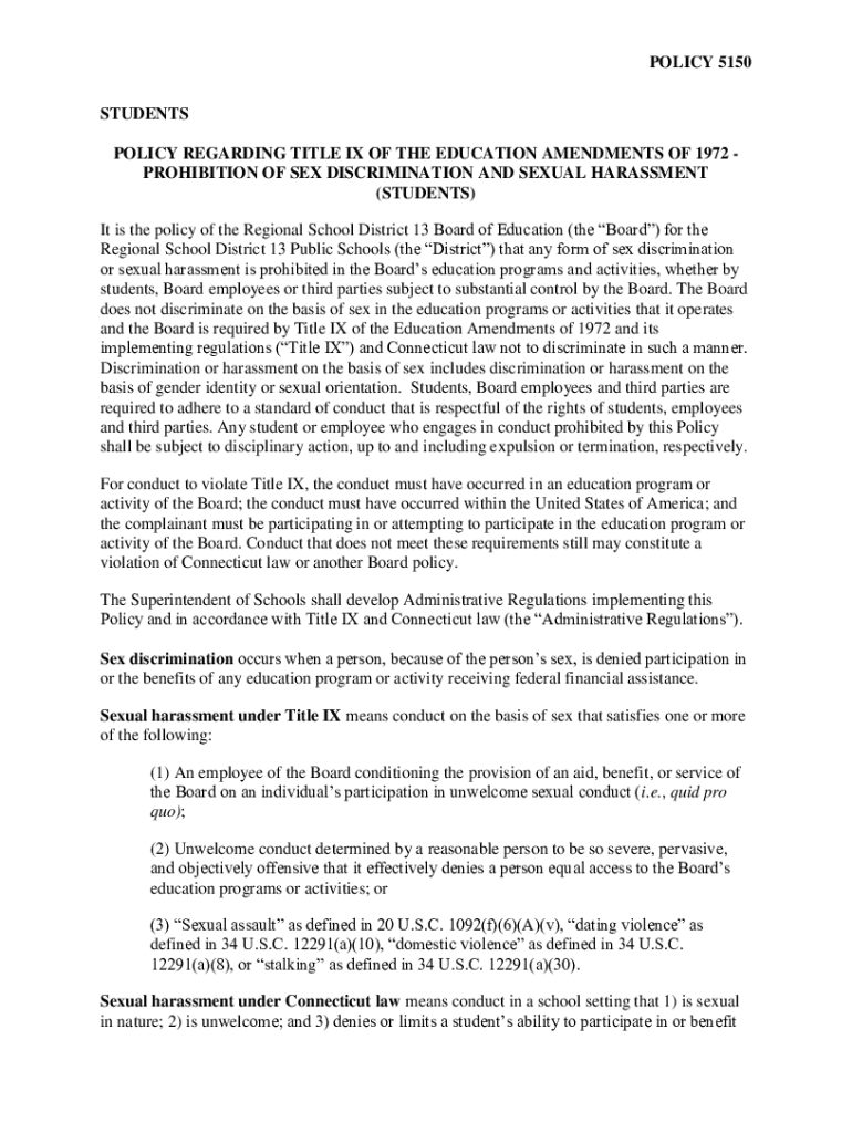 POLICY 5150 STUDENTS POLICY REGARDING TITLE IX OF THE EDUCATION AMENDMENTS OF 1972 PROHIBITION OF SEX DISCRIMINATION AND SEXUAL HARASSMENT (STUDENTS) It is the policy of the Regional School District