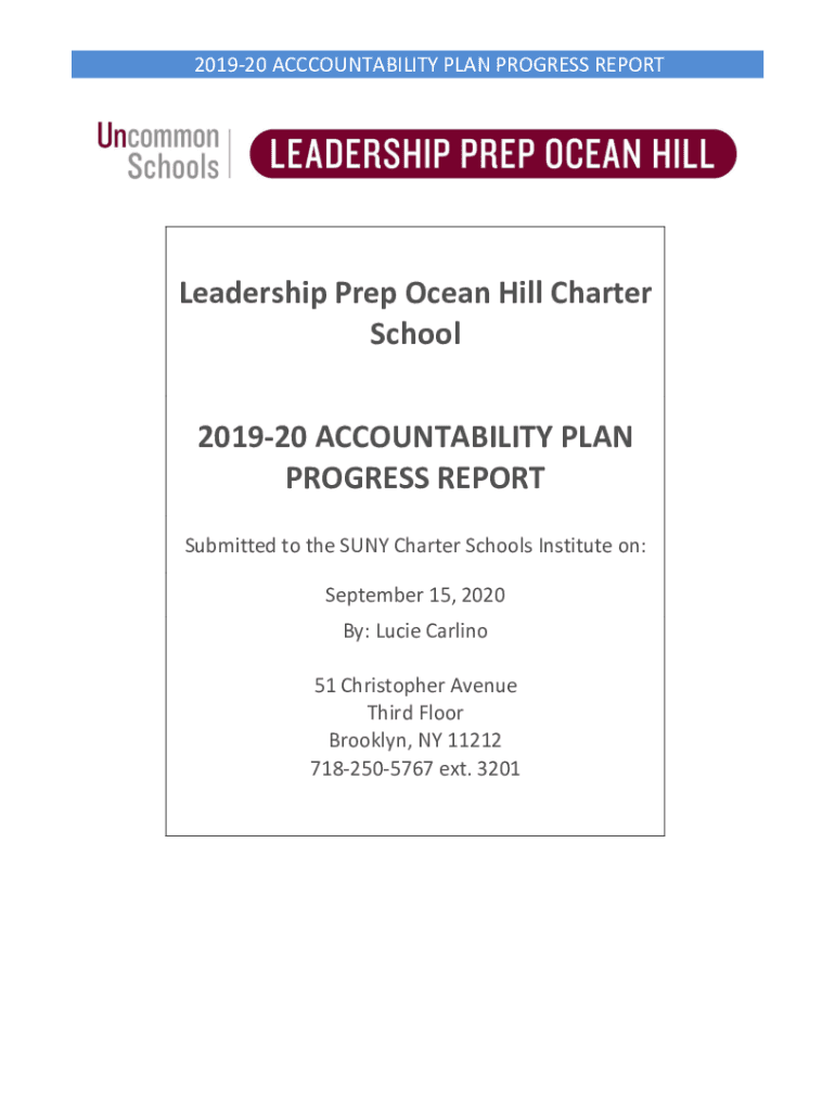 201920 ACCOUNTABILITY PLAN PROGRESS REPORTLeadership Prep Ocean Hill Charter School 201920 ACCOUNTABILITY PLAN PROGRESS REPORT Submitted to the SUN Charter Schools Institute on: September 15, 2020,