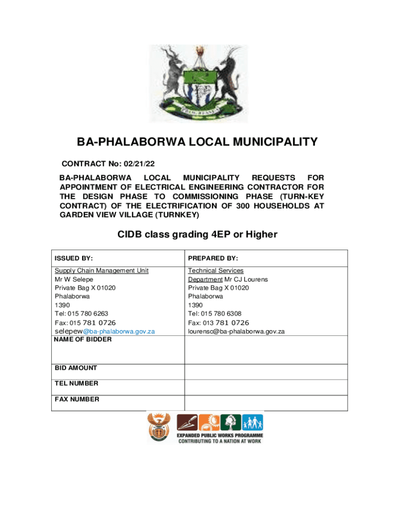 BAPHALABORWA LOCAL MUNICIPALITY CONTRACT No: 02/21/22 BAPHALABORWA LOCAL MUNICIPALITY REQUESTS FOR APPOINTMENT OF ELECTRICAL ENGINEERING CONTRACTOR FOR THE DESIGN PHASE TO COMMISSIONING PHASE (TURNKEY