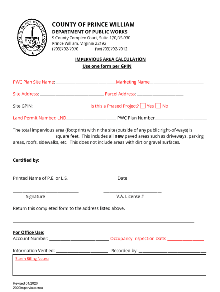 COUNTY OF PRINCE WILLIAM DEPARTMENT OF PUBLIC WORKS 5 County Complex Court, Suite 170,DS930 Prince William, Virginia 22192 (703)7927070 Fax(703)7927012IMPERVIOUS AREA CALCULATION Use one form per