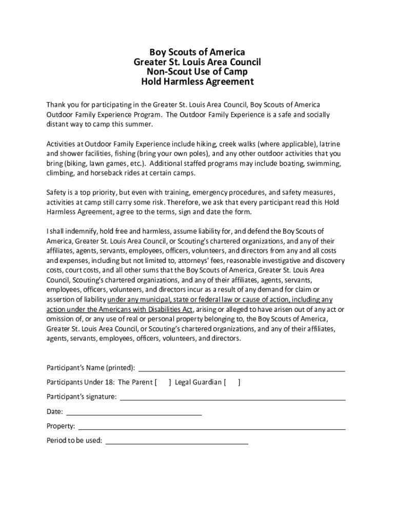 Get the free GSLAC Non-Scout Use of Camp Hold Harmless Agreement