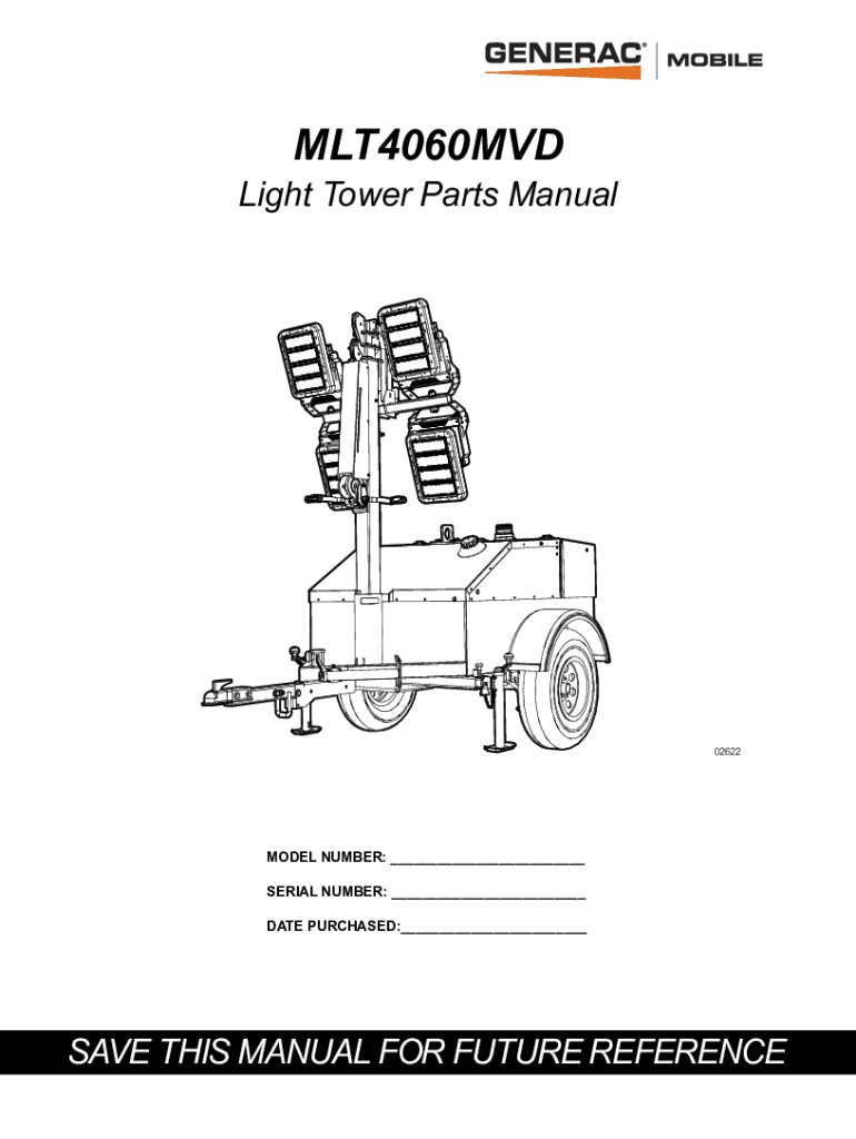 MLT4060MVDLight Tower Parts Manual02622MODEL NUMBER: ___ SERIAL NUMBER: ___ DATE PURCHASED:___SAVE THIS MANUAL FOR FUTURE REFERENCEWARNING CANCER AND REPRODUCTIVE HARM www.P65Warnings.ca.gov. (000393a)WARNING