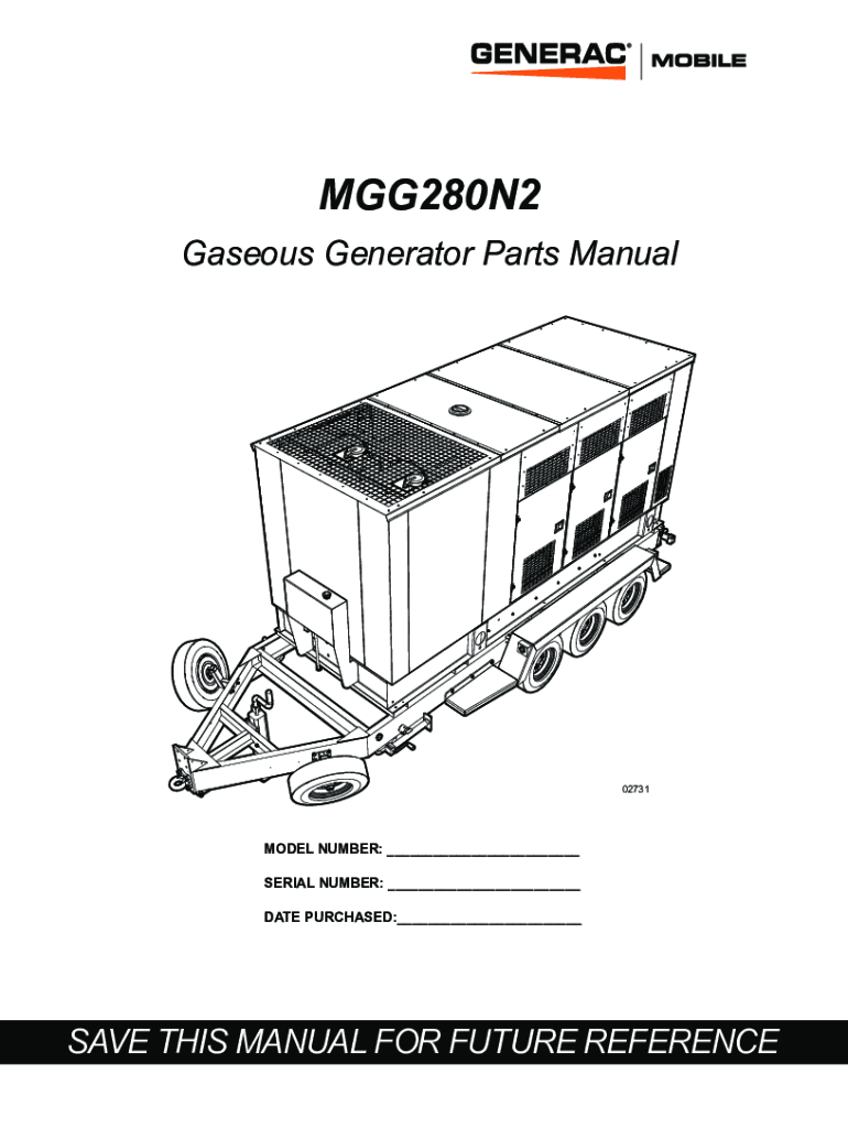 MGG280N2 Gaseous Generator Parts Manual02731MODEL NUMBER: ___ SERIAL NUMBER: ___ DATE PURCHASED:___SAVE THIS MANUAL FOR FUTURE REFERENCEWARNING CANCER AND REPRODUCTIVE HARM www.P65Warnings.ca.gov.