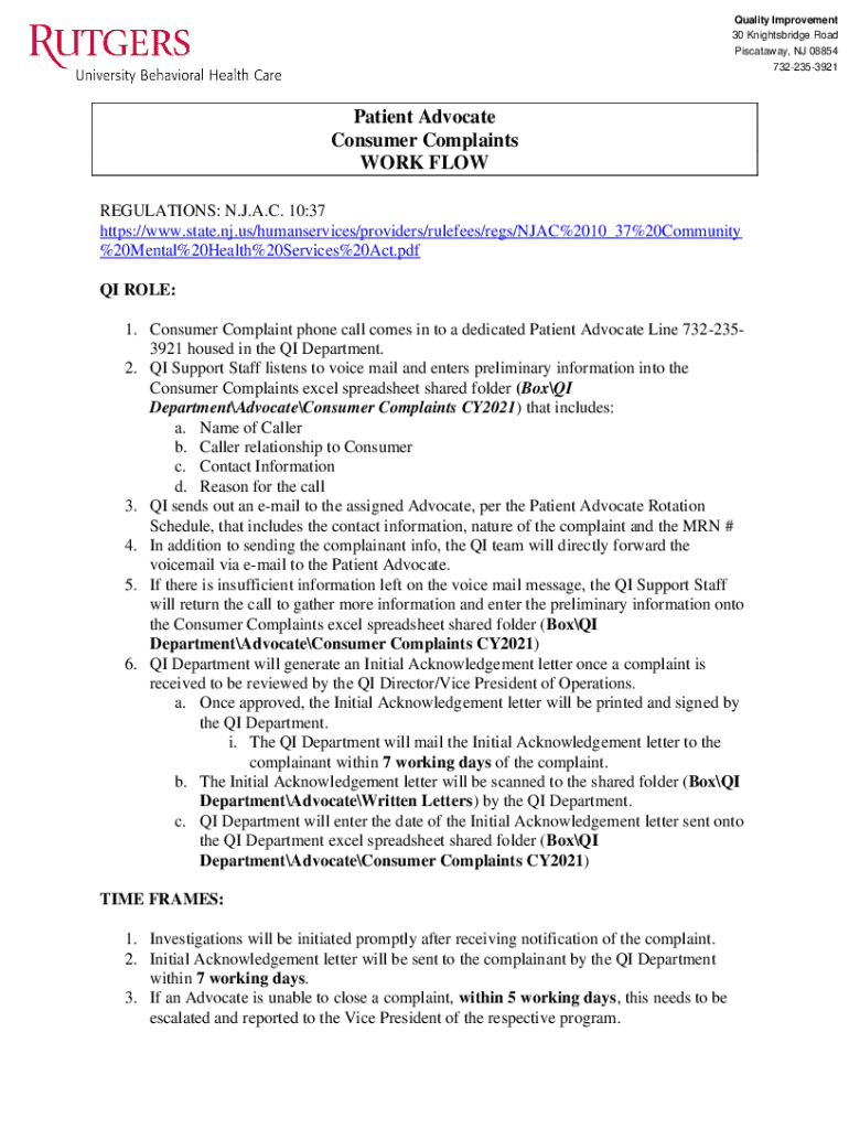 Quality Improvement 30 Knights bridge Road Piscataway, NJ 08854 7322353921Patient Advocate Consumer Complaints WORK FLOW REGULATIONS: N.J.A.C. 10:37 https://www.state.nj.us/humanservices/providers/rulefees/regs/NJAC%2010_37%20Community