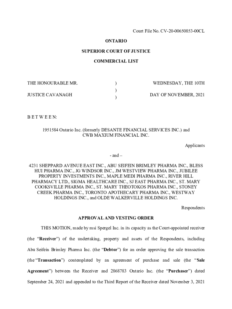Court File No. CV200065085300CL ONTARIO SUPERIOR COURT OF JUSTICE COMMERCIAL LITTLE HONORABLE MR. JUSTICE KAVANAUGH)))WEDNESDAY, THE 10TH DAY OF NOVEMBER, 2021B E T W E E N: 1951584 Ontario Inc. (formerly