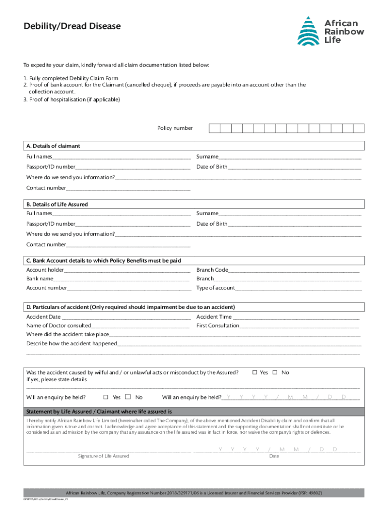 African Rainbow LifeDebility/Dread Disease expedite your claim, kindly forward all claim documentation listed below: 1. Fully completed Debility Claim Form 2. Proof of bank account for the Claimant