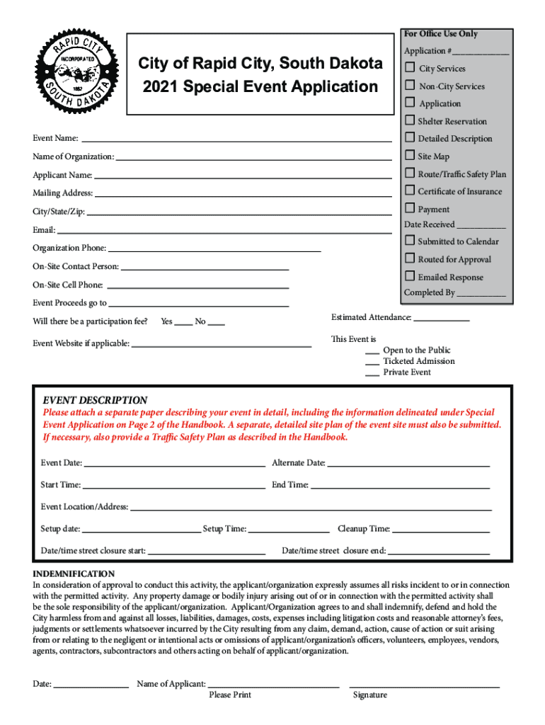 For Office Use Velocity of Rapid City, South Dakota 2021 Special Event Application Event Name:Name of Organization:Applicant Name:Mailing Address:City/State/Zip:Organization Phone:Onsite Contact Person:Onsite