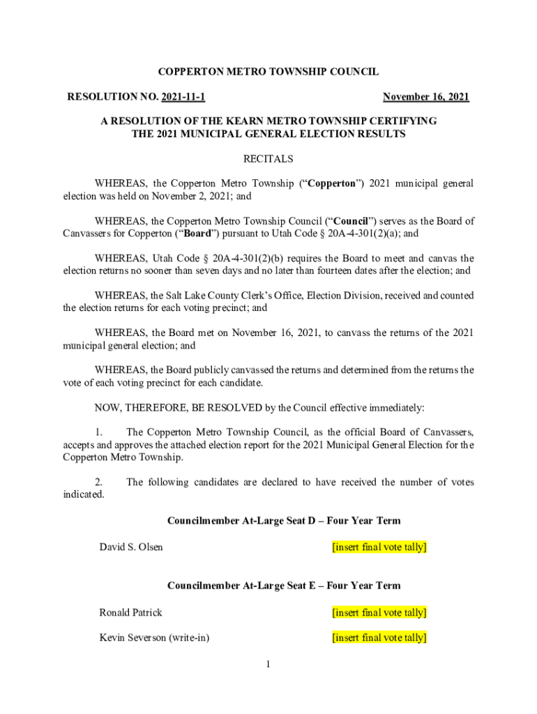 COPPERTONE METRO TOWNSHIP COUNCIL RESOLUTION NO. 2021111November 16, 2021A RESOLUTION OF THE LEARN METRO TOWNSHIP CERTIFYING THE 2021 MUNICIPAL GENERAL ELECTION RESULTS RECITALS WHEREAS, the Coppertone