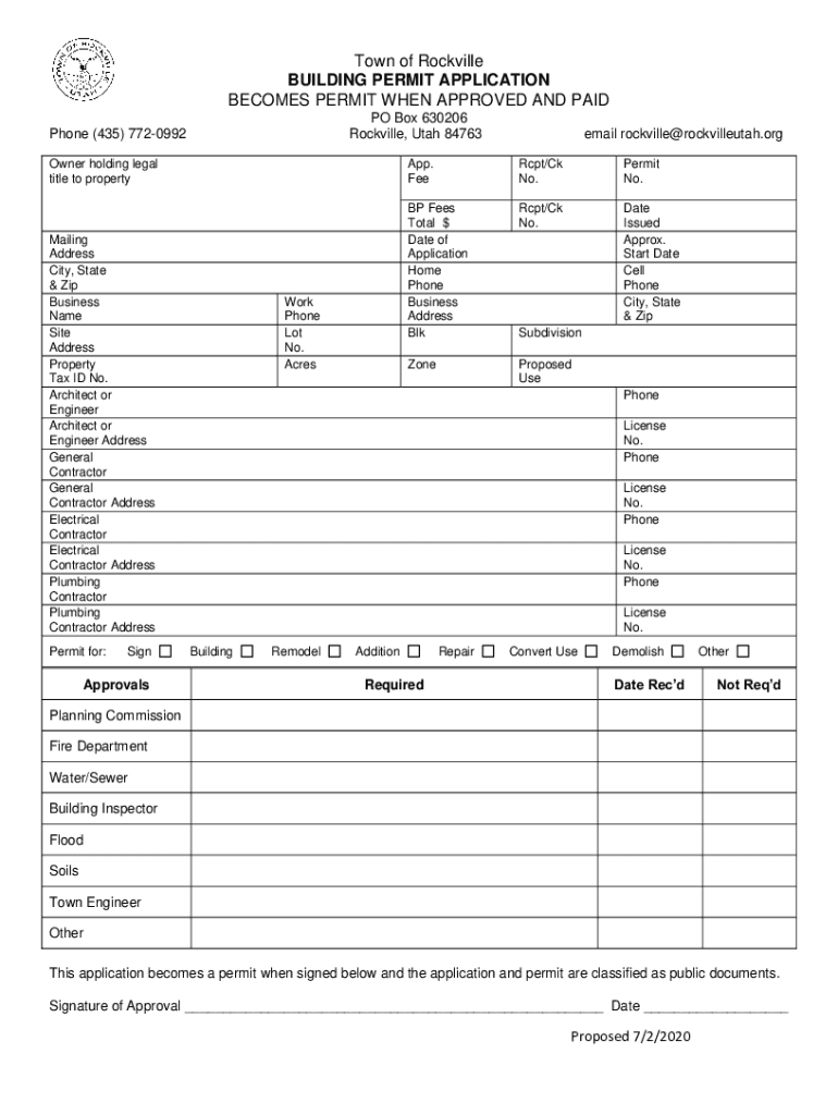 Town of Rockville BUILDING PERMIT APPLICATION BECOMES PERMIT WHEN APPROVED AND PAID PO Box 630206 Rockville, Utah 84763Phone (435) 7720992 Owner holding legal title to propertyMailing Address City,