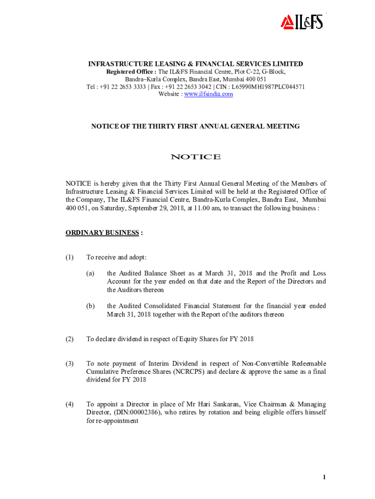 INFRASTRUCTURE LEASING & FINANCIAL SERVICES LIMITED Registered Office : The ILLS Financial Center, Plot C22, Block, BandraKurla Complex, Sandra East, Mumbai 400 051 Tel : +91 22 2653 3333 | Fax :