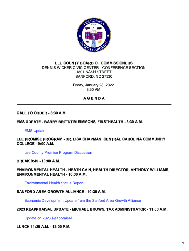 LEE COUNTY BOARD OF COMMISSIONERS DENNIS WICKER CIVIC CENTER CONFERENCE SECTION 1801 NASH STREET SANFORD, NC 27330 Friday, January 28, 2022 8:30 AM AGENDACALL TO ORDER 8:30 A.M. EMS UDP ATE BARRY
