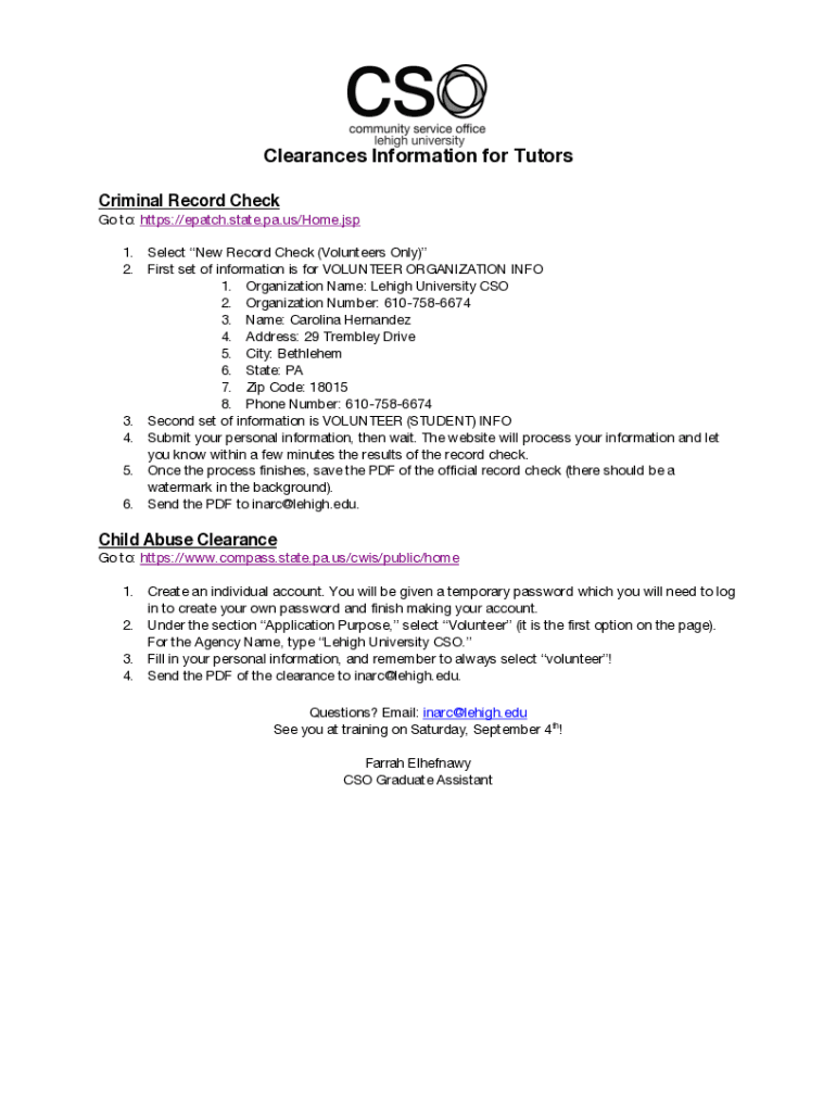 Clearances Information for Tutors Criminal Record Check Go to: https://epatch.state.pa.us/Home.jsp 1. Select New Record Check (Volunteers Only) 2. First set of information is for VOLUNTEER ORGANIZATION