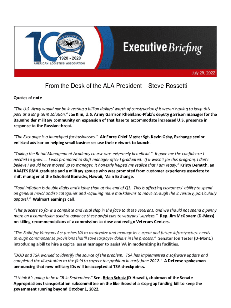 From the Desk of the ALA President Steve Rossetti Quotes of note The U.S. Army would not be investing a billion dollars worth of construction if it weren't going to keep this post as a long term solution.