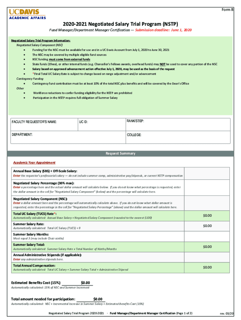 Form B20202021 Negotiated Salary Trial Program (NTP) Fund Manager/Department Manager Certification Submission deadline: June 1, 2020, Negotiated Salary Trial Program Information: Negotiated Salary