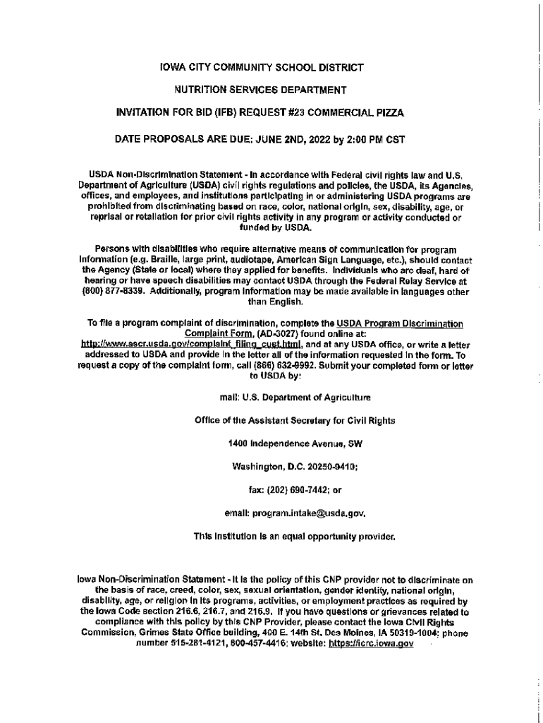 IOWA CITY COMMUNITY SCHOOL DISTRICT NUTRITION SERVICES DEPARTMENT INVITATION FOR BID (IF) REQUEST #23 COMMERCIAL PIZZA DATE PROPOSALS ARE DUE: JUNE 2ND, 2022 by 2:00 PM CST USDA Nondiscrimination