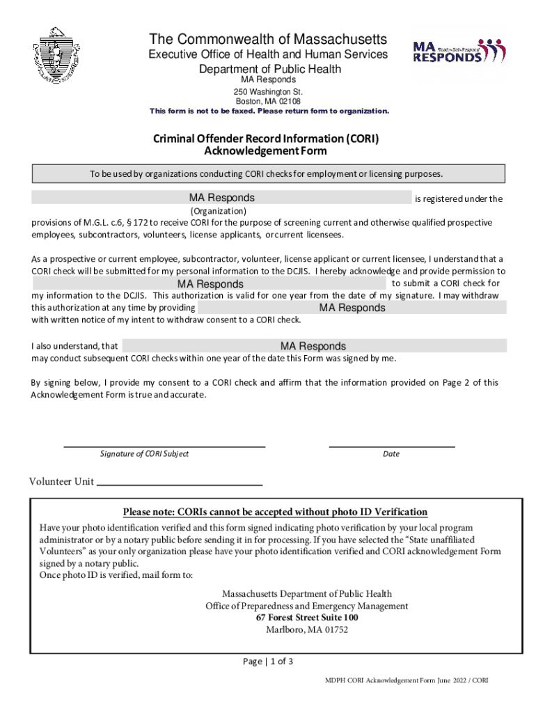 The Commonwealth of Massachusetts Executive Office of Health and Human Services Department of Public Health MA Responds 250 Washington St. Boston, MA 02108 This form is not to be faxed. Please return