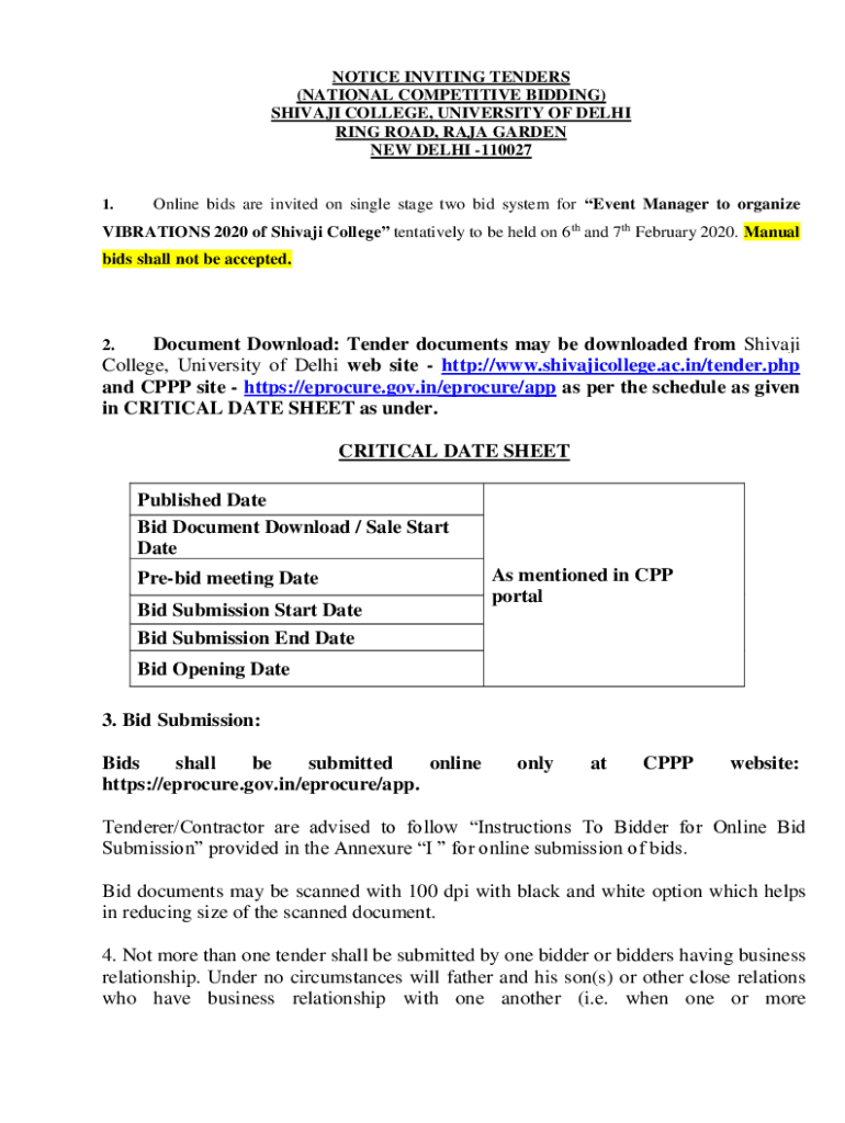 NOTICE INVITING TENDERS (NATIONAL COMPETITIVE BIDDING) SHIV AJI COLLEGE, UNIVERSITY OF DELHI RING ROAD, RAJA GARDEN NEW DELHI 1100271. Online bids are invited on single stage two bid system for Event