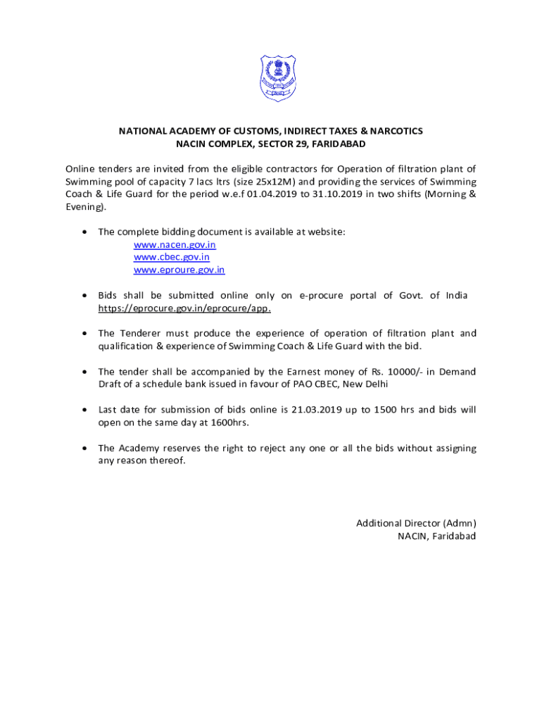 NATIONAL ACADEMY OF CUSTOMS, INDIRECT TAXES & NARCOTICS NIACIN COMPLEX, SECTOR 29, FARIDABAD Online tenders are invited from the eligible contractors for Operation of filtration plant of Swimming