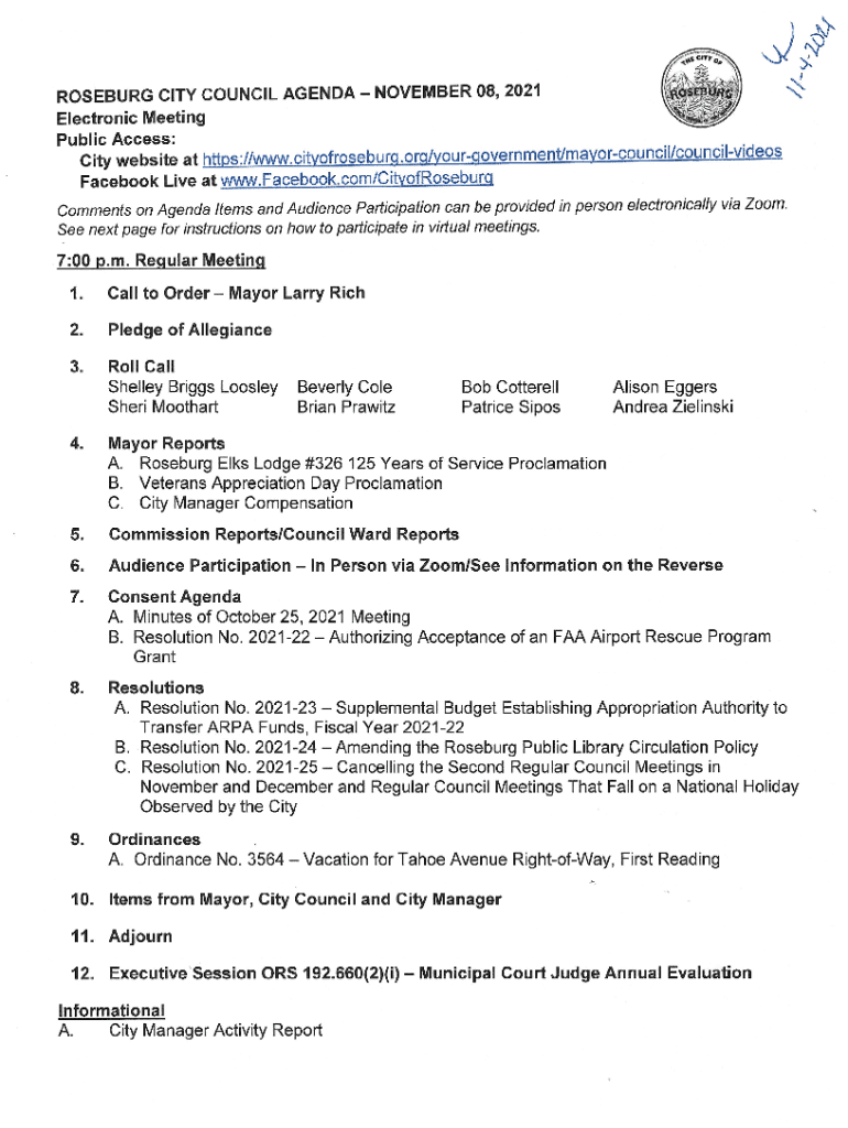 AUDIENCE PARTICIPATION INFORMATION The Roseburg City Council welcomes and encourages participation by citizens at all our meetings, except Executive Sessions, which, by state law, are closed to the