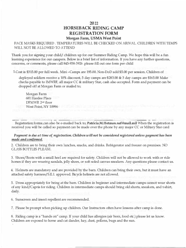 20 22 HORSEBACK RIDING CAMP REGISTRATION FORM Morgan Farms, USA West Point FACE MASKS REQUIRED. TEMPERATURES WILL BE CHECKED ON ARRIVAL. CHILDREN WITH TEMPS WILL NOT BE ALLOWED TO ATTEND Thank you