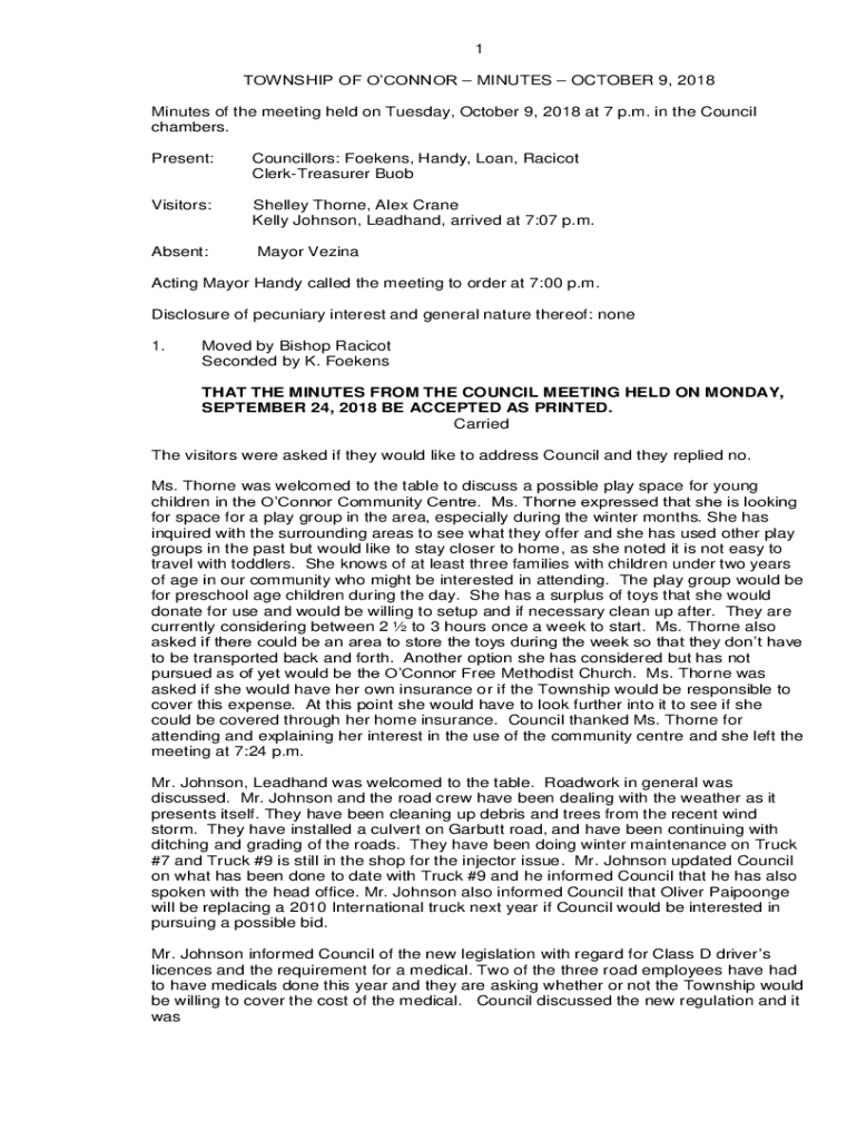 1 TOWNSHIP OF O'Connor MINUTES OCTOBER 9, 2018, Minutes of the meeting held on Tuesday, October 9, 2018, at 7 p.m. in the Council chambers. Present:Councillors: Foe kens, Handy, Loan, Racist ClerkTreasurer