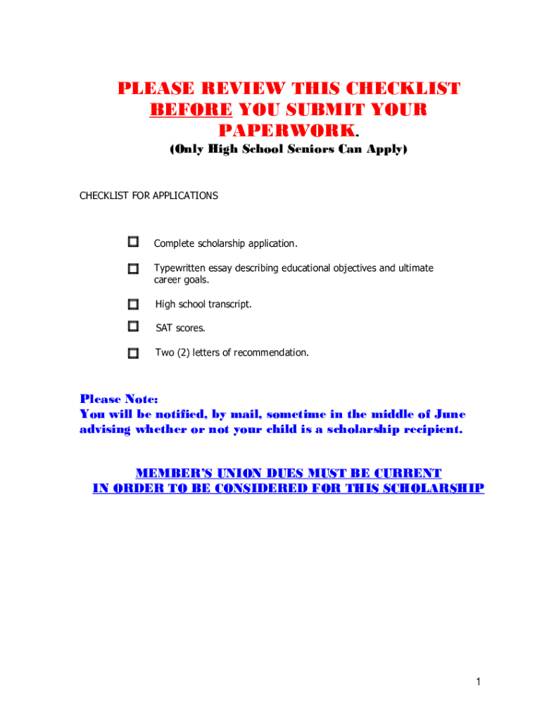 PLEASE REVIEW THIS CHECKLIST BEFORE YOU SUBMIT YOUR PAPERWORK. (Only High School Seniors Can Apply)CHECKLIST FOR APPLICATIONSComplete scholarship application. Typewritten essay describing educational