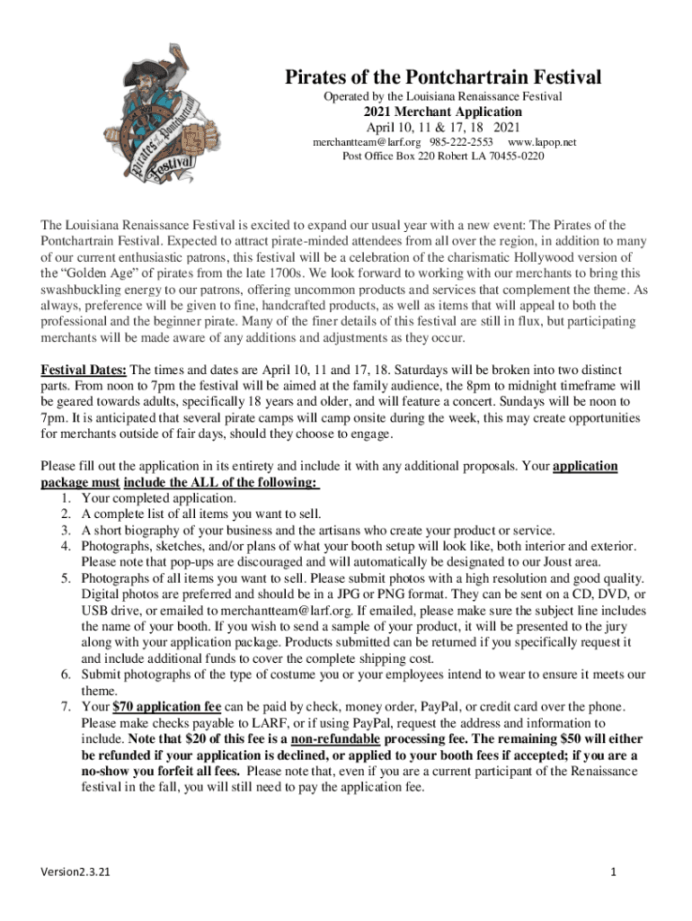 Pirates of the Pontchartrain Festival Operated by the Louisiana Renaissance Festival2021 Merchant Application April 10, 11 & 17, 18 2021 merchantteam@larf.org 9852222553 www.lapop.net Post Office