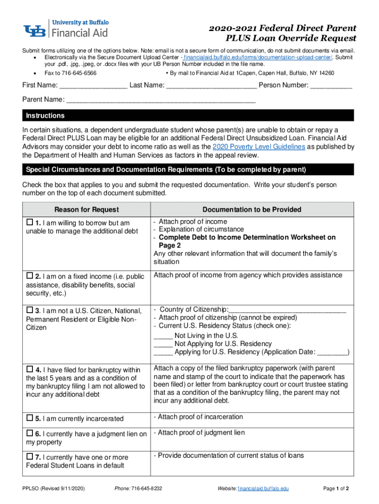 20202021 Federal Direct Parent PLUS Loan Override Request Submit forms utilizing one of the options below. Note: email is not a secure form of communication, do not submit documents via email. Electronically