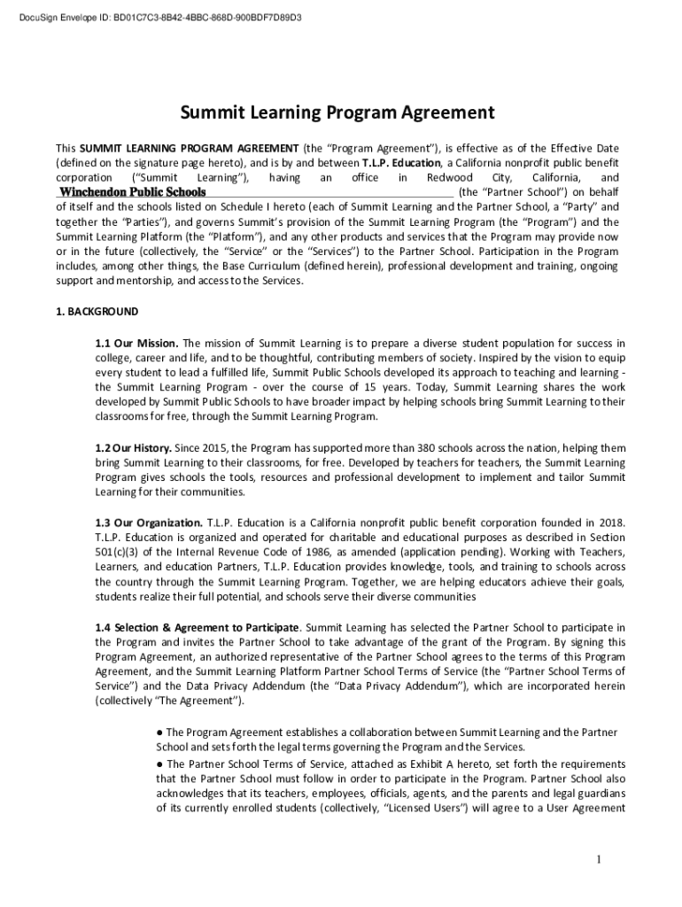 DocuSign Envelope ID: BD01C7C38B424BBC868D900BDF7D89D3Summit Learning Program Agreement This SUMMIT LEARNING PROGRAM AGREEMENT (the Program Agreement), is effective as of the Effective Date (defined