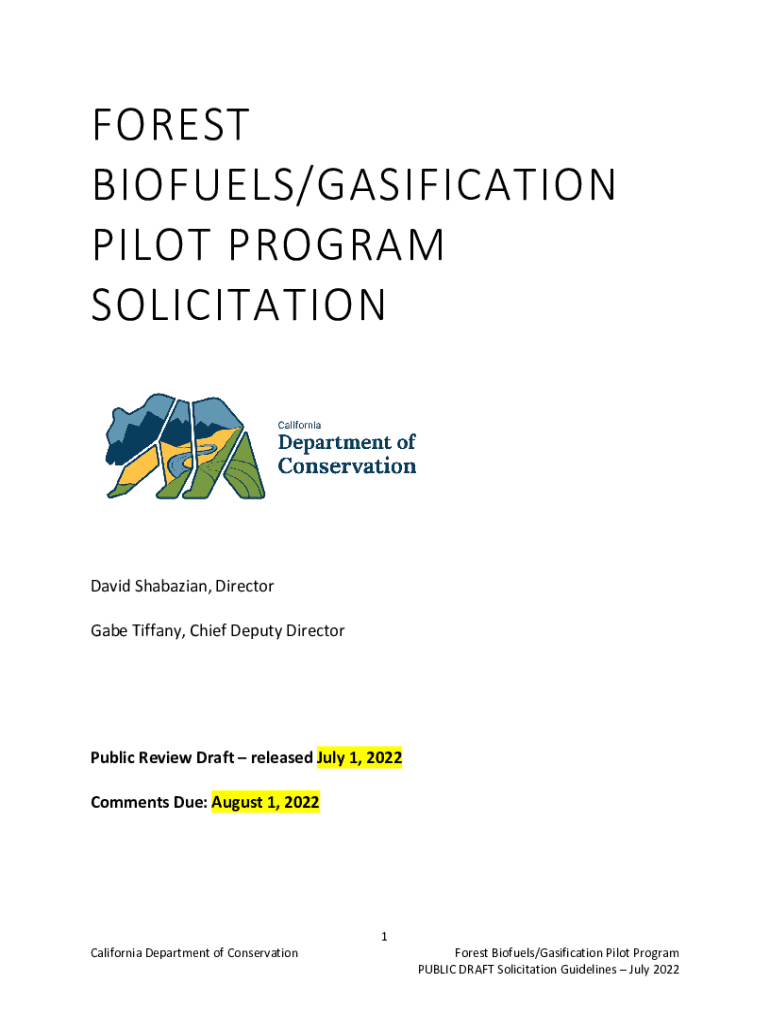 FOREST BIOFUELS/GAMIFICATION PILOT PROGRAM SOLICITATION David Hawaiian, Director Gabe Tiffany, Chief Deputy DirectorPublic Review Draft released July 1, 2022, Comments Due: August 1, 2022California