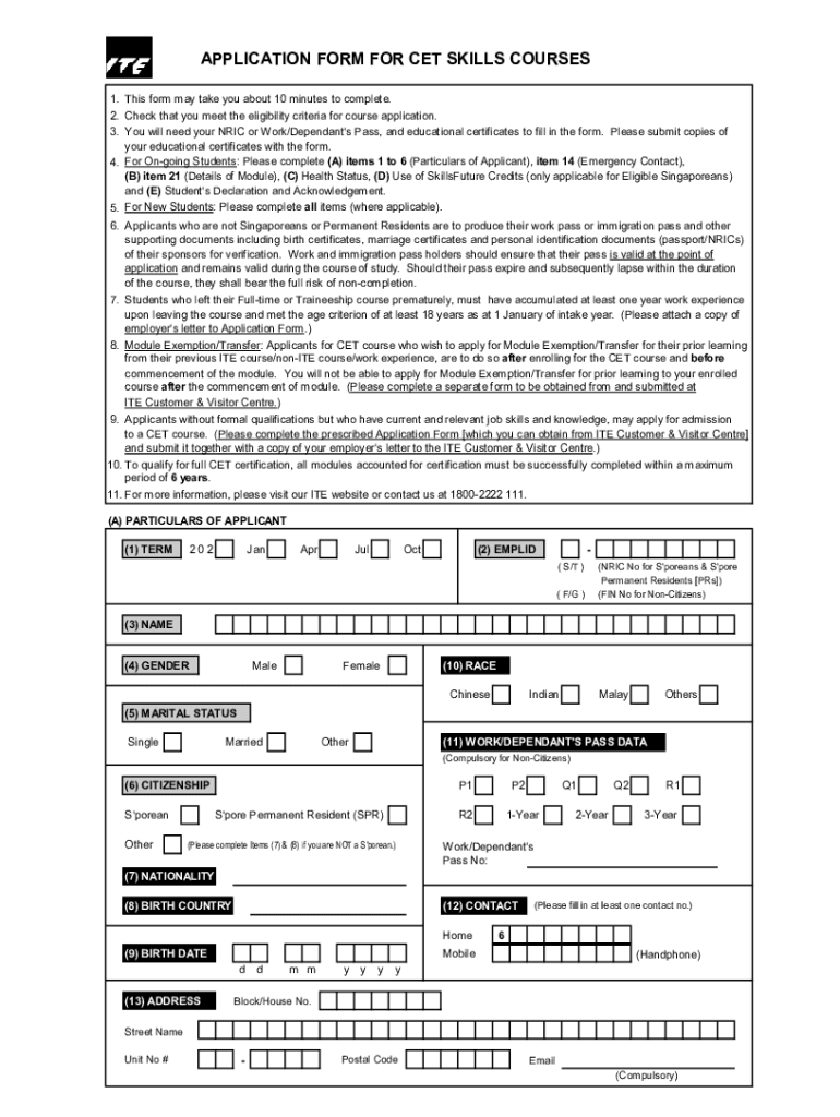 APPLICATION FORM FOR CET SKILLS COURSES 1. This form may take you about 10 minutes to complete. 2. Check that you meet the eligibility criteria for course application. 3. You will need your ERIC or