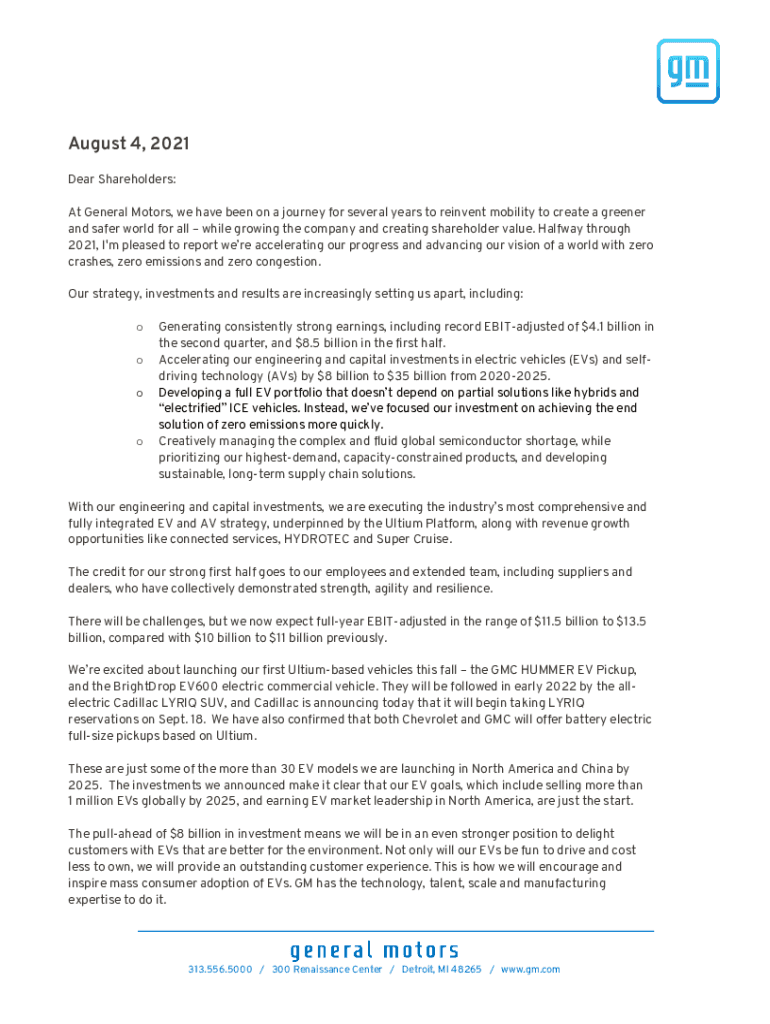 August 4, 2021, Dear Shareholders: At General Motors, we have been on a journey for several years to reinvent mobility to create a greener and safer world for all while growing the company and creating