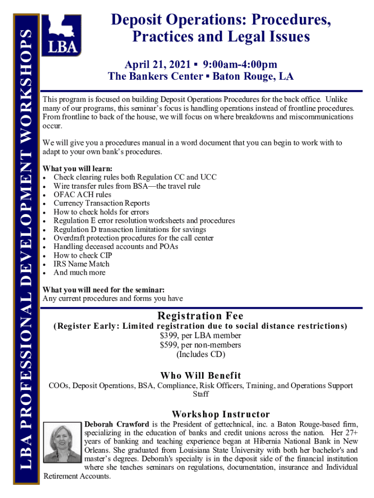 LBA PROFESSIONAL DEVELOPMENT WORKSHOPSDeposit Operations: Procedures, Practices and Legal Issues April 21, 2021 9:00am4:00pm The Bankers Center Baton Rouge, LA This program is focused on building