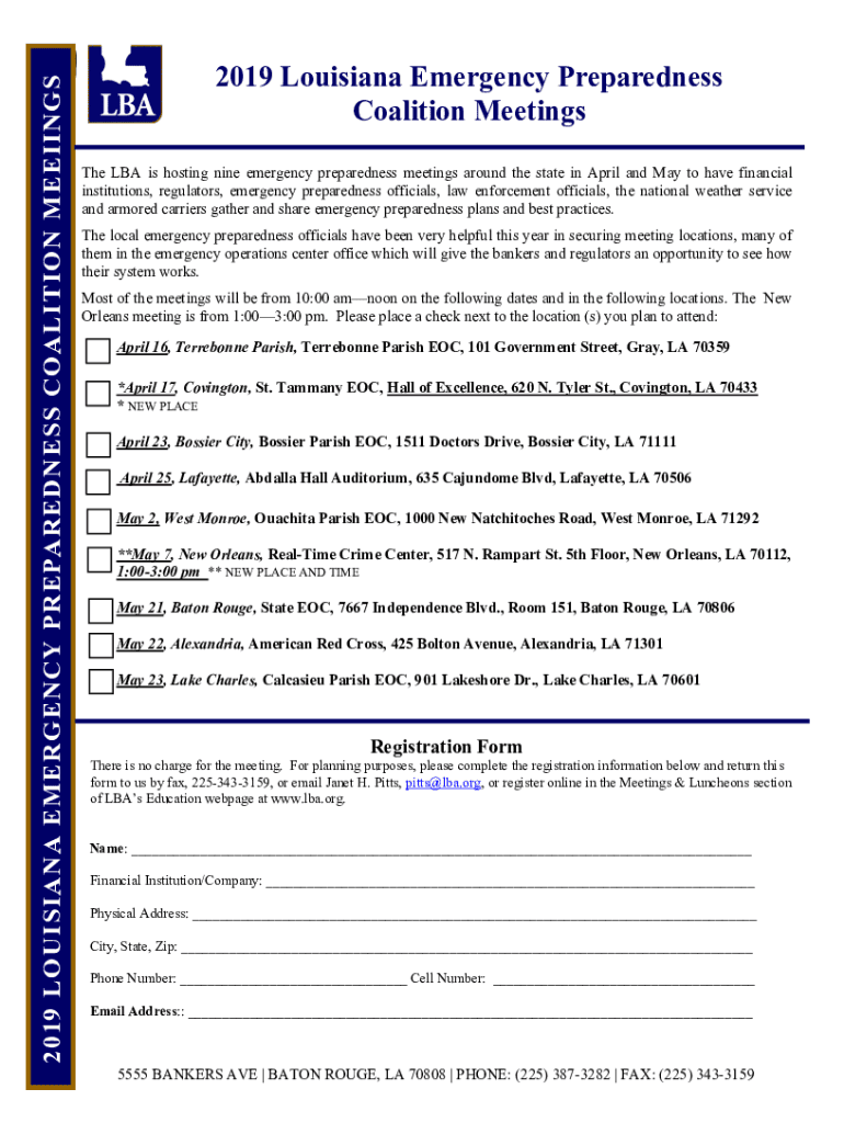 2019 LOUISIANA EMERGE NCY PREPAREDNESS COALITION MEEIINGS2019 Louisiana Emergency Preparedness Coalition Meetings The LBA is hosting nine emergency preparedness meetings around the state in April