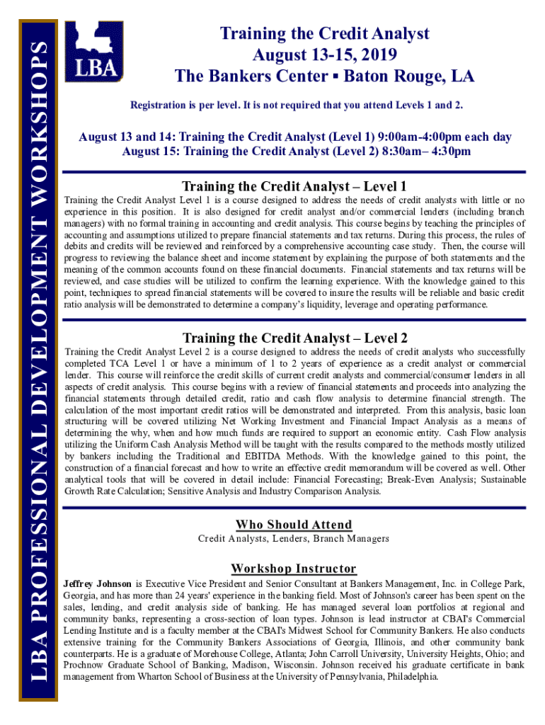 LBA PROFESSIONAL DEVELOPMENT WORKSHOPSTraining the Credit Analyst August 1315, 2019 The Bankers Center Baton Rouge, LA Registration is per level. It is not required that you attend Levels 1 and 2.